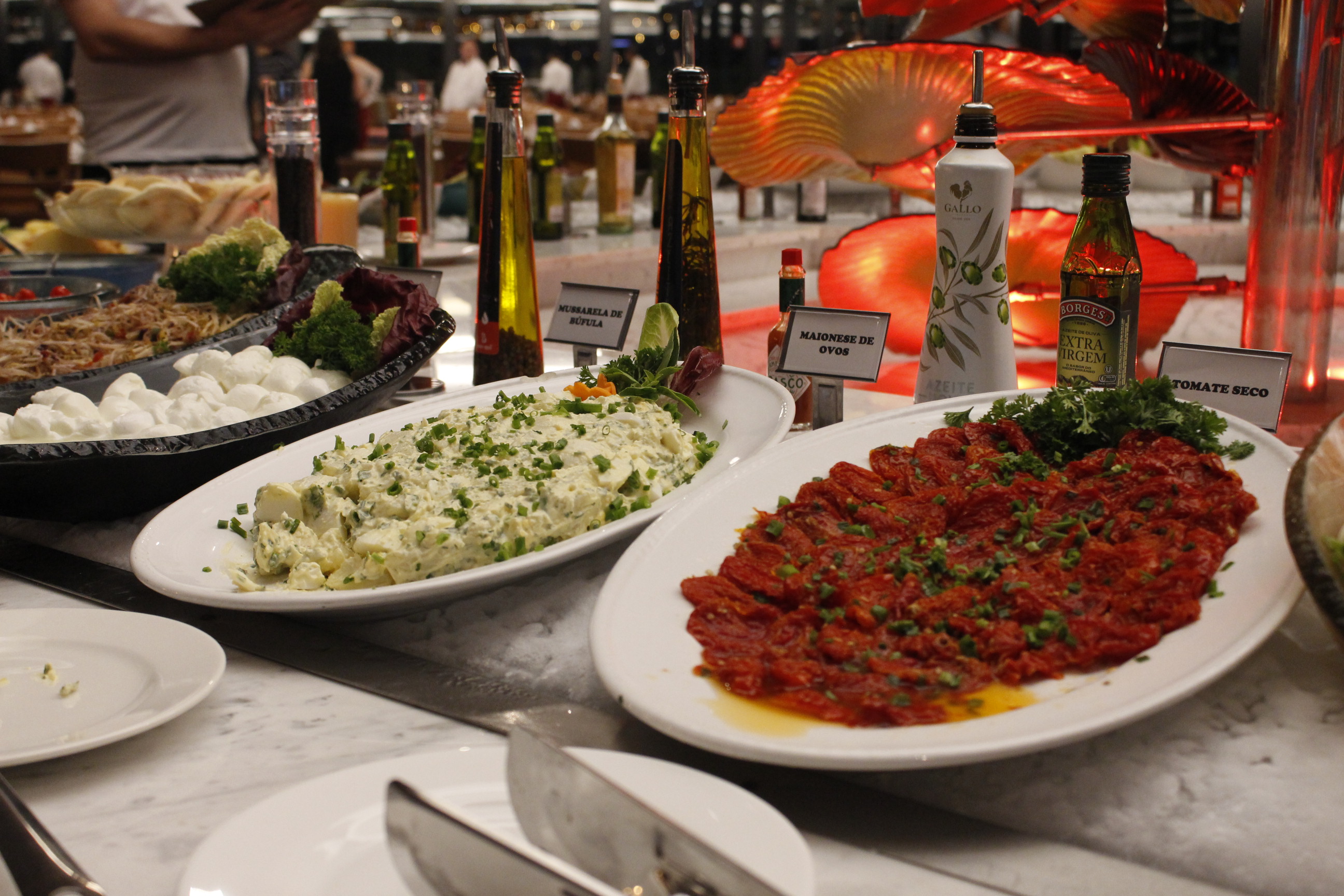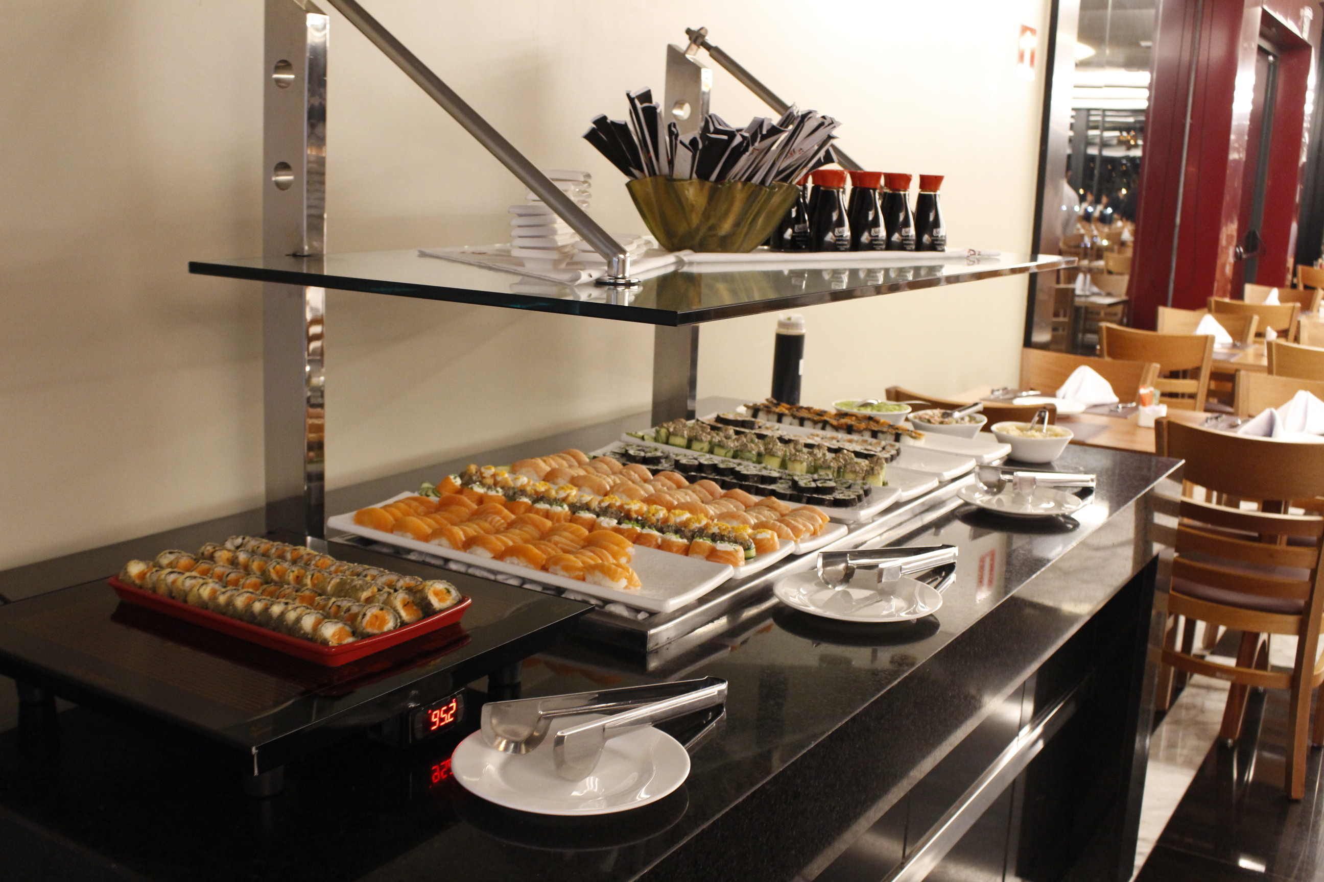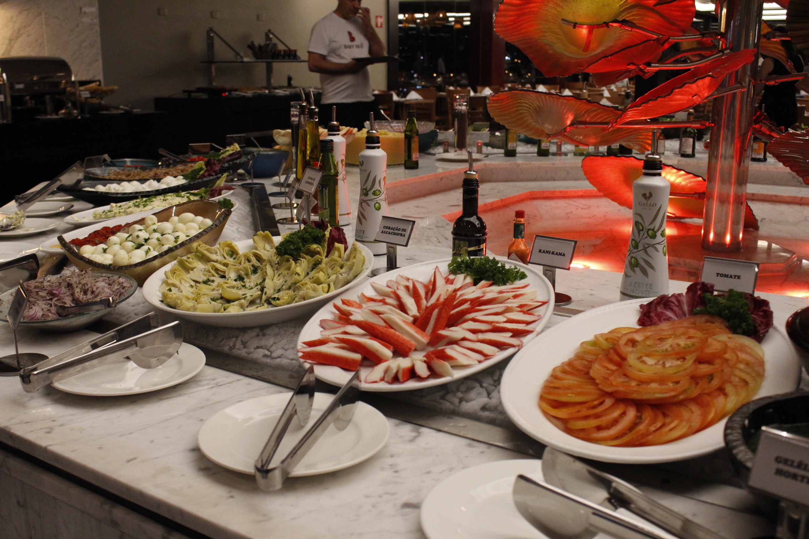 Uma ilha entre o primeiro e o segundo salão oferece opções variadas de frios, antepastos e guarnições, além do bufffet de comida japonesa. No primeiro salão se encontra a Backer Station, bar que serve cervejas especiais da marca mineira.